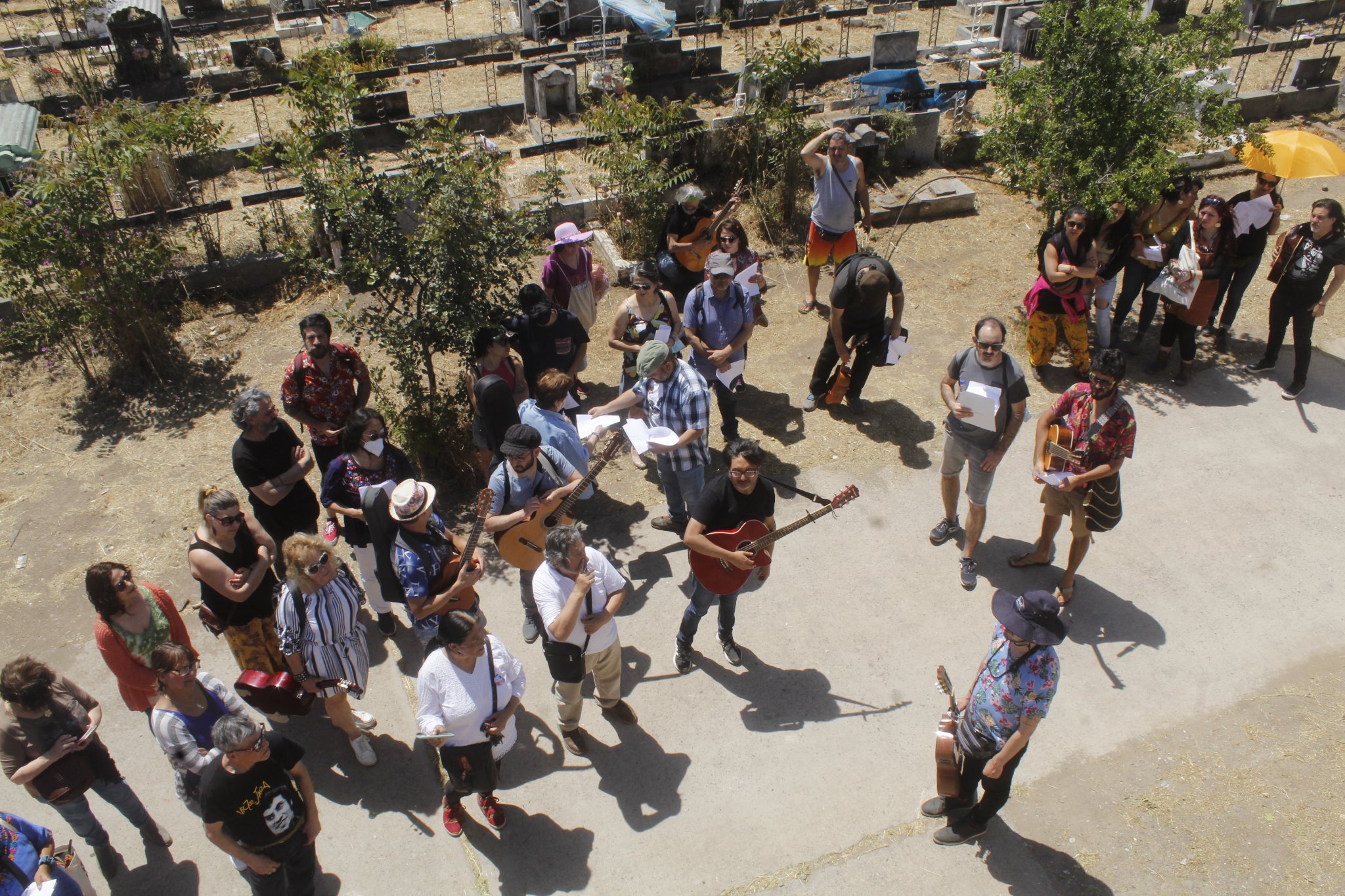 El punto de encuentro fue la tumba de Violeta Parra, donde se interpretaron las canciones «Arriba quemando el sol» y «Arauco tiene una pena», y las presentaciones del Dúo Epiphanía y La Resak. A continuación, la caravana partió hacia la tumba del recordado ex integrante del Quilapayún, Willy Oddó, quien falleció en extrañas circunstancias en 1991. En su honor, l@s guitarristas interpretaron «Canto a la pampa» (texto del poeta anarquista Francisco Pezoa musicalizado por el «Quila» y popularizado en la voz de Oddó) y «La muralla». Además, el cantor Alejandro Zagal interpretó una sentida versión de la canción «El Plan Leopardo», texto anónimo musicalizado por Oddó.